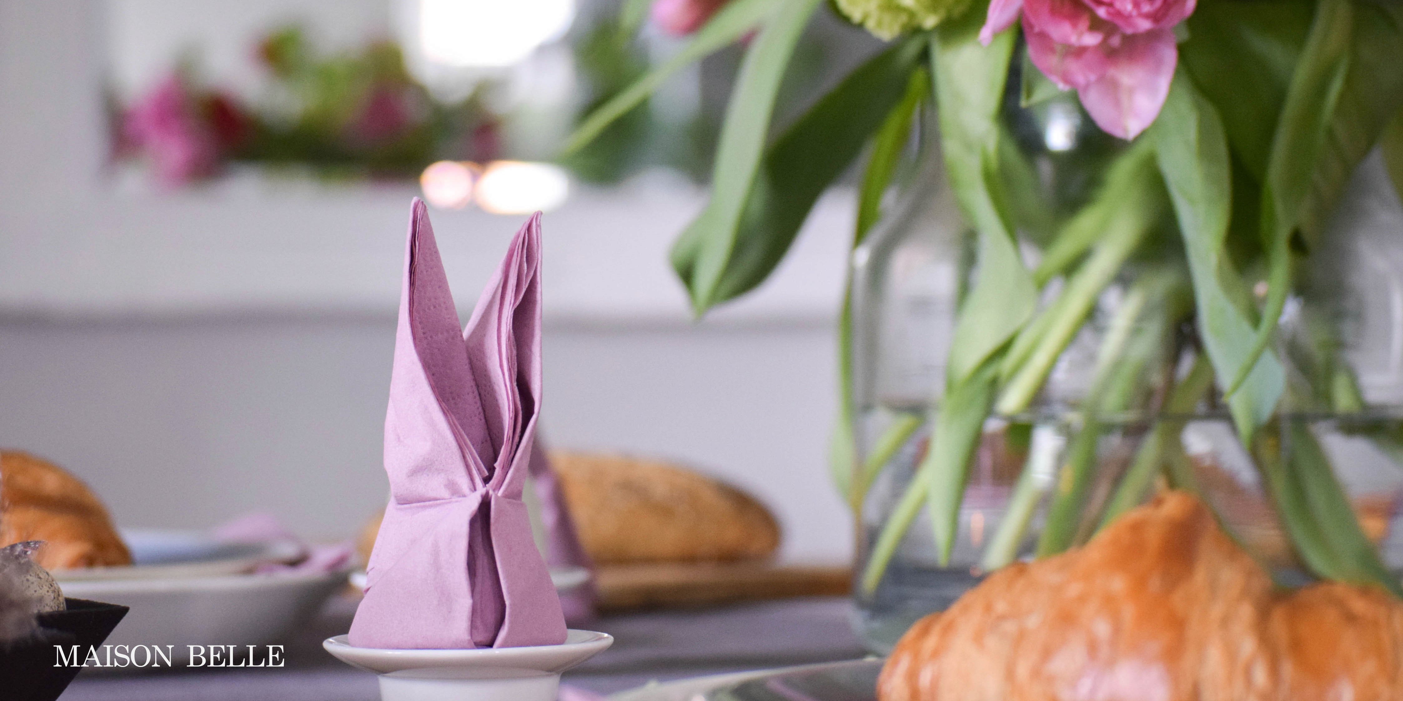 Ik kocht servetten in oud roze om het geheel wat warmer te maken. De servetten vouw ik in de vorm van een paashaas, dat is heel eenvoudig te doen. In de tekening zie je hoe je dat doet.