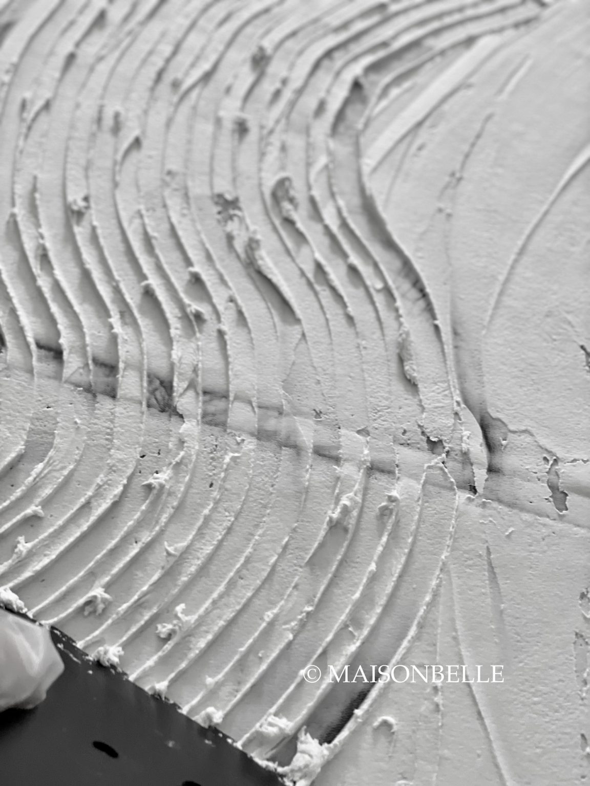 STAP 2: Nu begint het echte werk: muurvuller. Ik kocht hiervoor sneldrogende vuller zodat ik ook snel verder kon. Je smeert een flinke dot muurvuller op het canvas doek en strijkt dit glad uit met een plamuurmes. Zodat er een laagje over het hele doek zit. Ga daarna met een lijmkam, het liefst met een grove textuur over het doek en maak een vorm. Til de kam niet op tot je aan het einde van het doek bent, anders krijg je onderbrekingen in je 3-d vorm. En zo ga je verder van boven naar beneden tot je het hele doek gevuld hebt. De lijmkam strijk ik steeds af aan een bakje zodat ik die muurvuller weer kan hergebruiken. Wordt de muurvuller te snel droog voordat je het patroon gemaakt hebt? Dan kan je er een klein beetje water uit een plantenspuit over sprayen en daarna het patroon ‘kammen’. Niet teveel water, anders wordt het doek te nat.