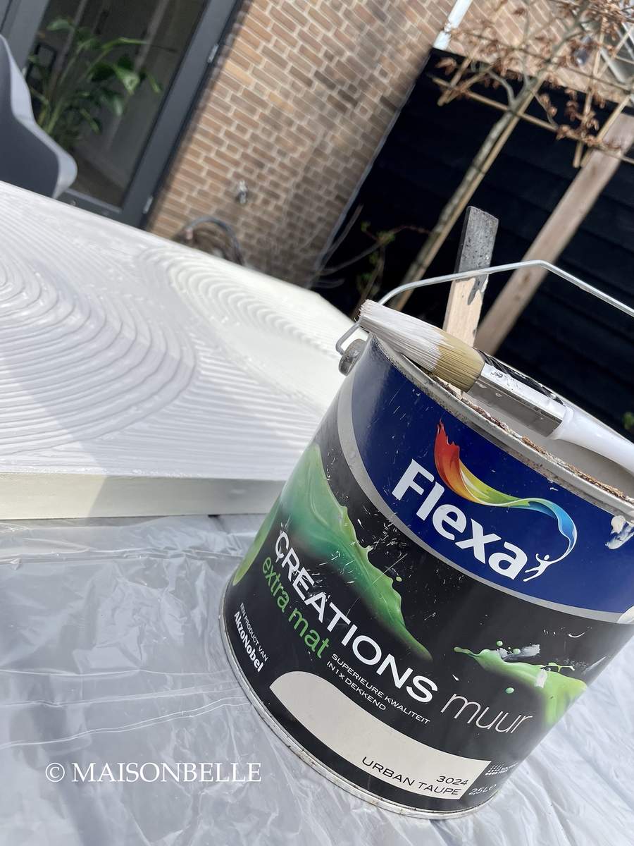 STAP 3: Na het drogen (op de verpakking staat de droogtijd) heb ik alles grof geschilderd met een kwast en muurverf. Dit was een pot Urban Taupe van Flexa die ik nog had staan. Deze kleur is absoluut één van mijn favoriete taupe tinten: het is heel warm en zorgt voor een rustige uitstraling. Na de eerste verflaag vond ik het wat te netjes, ik heb wat zand door de muurverf gemengd om de verf korrelig te maken. Na het even te laten drogen heb ik een derde laag aangebracht tot er geen wit meer te zien was. Je kunt vast ook structuurverf gebruiken maar dit is een mooie manier om restanten verf te hergebruiken.