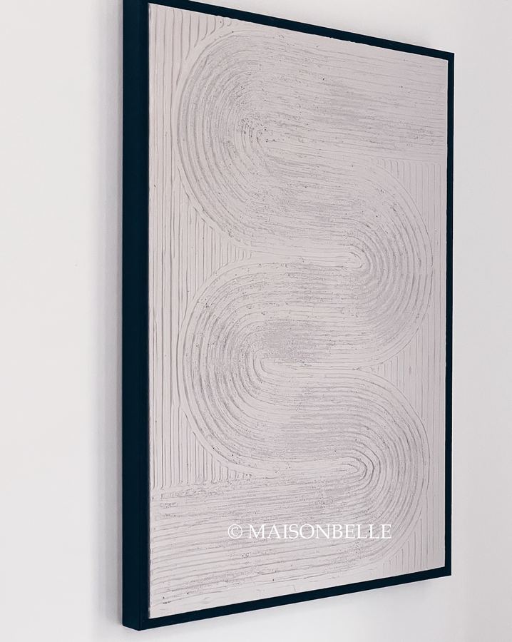 Het resultaat is een zelfgemaakte 3-d canvas schilderij met een hele rustige uitstraling. Ik vind het heel goed gelukt. De kleur waarmee je het schildert bepaalt een groot deel van de uitstraling. Ik koos voor een lichte taupe tint met zwarte baklijst. Ook mooi is om zwarte of donkerblauwe verf te gebruiken met een houten lijst, dan krijgt het een heel chique effect.