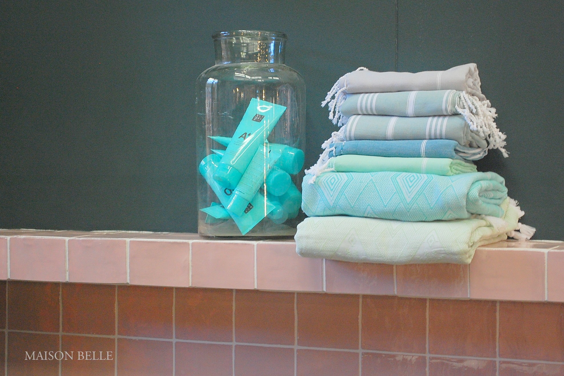 Marokkaanse accessoires en schalen geven de badkamer een heerlijke, oosterse sfeer.