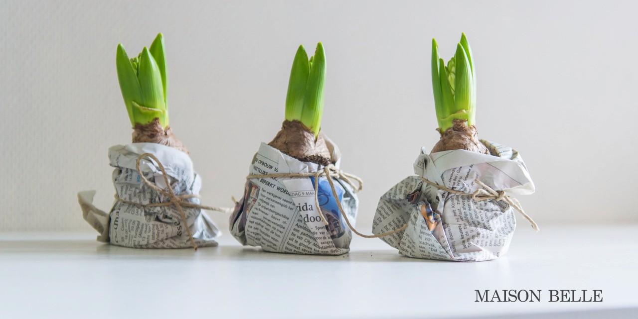 STAP 5. Geef ze een mooi plekje in huis. Mocht je de bollen toch wat water willen geven dan haal je de krant even los en zet je ze op een schoteltje. Als ze weer droog zijn wikkel je ze weer in een krant.