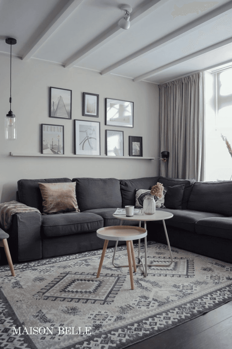 De zithoek is één van onze favoriete plekken in huis. Omdat dat dé plek is waar je neerploft om lekker te ontspannen als je niks meer hoeft. Ons huis is niet zo groot maar heeft een woonkamer met gezellige hoekjes, daarom blijft het best een uitdaging om de zithoek goed in te richten. De grijze hoekbank is de grootste vriend van manlief en onze twee kinderen. Hij zit en ligt heerlijk en biedt mij met zijn neutrale kleur de mogelijkheid om zo nu en dan te re-stylen, een goede keuze dus voor ons allemaal. ;) Soms wissel ik de kussens, de bijzettafeltjes, het vloerkleed of de lijsten aan de muur.