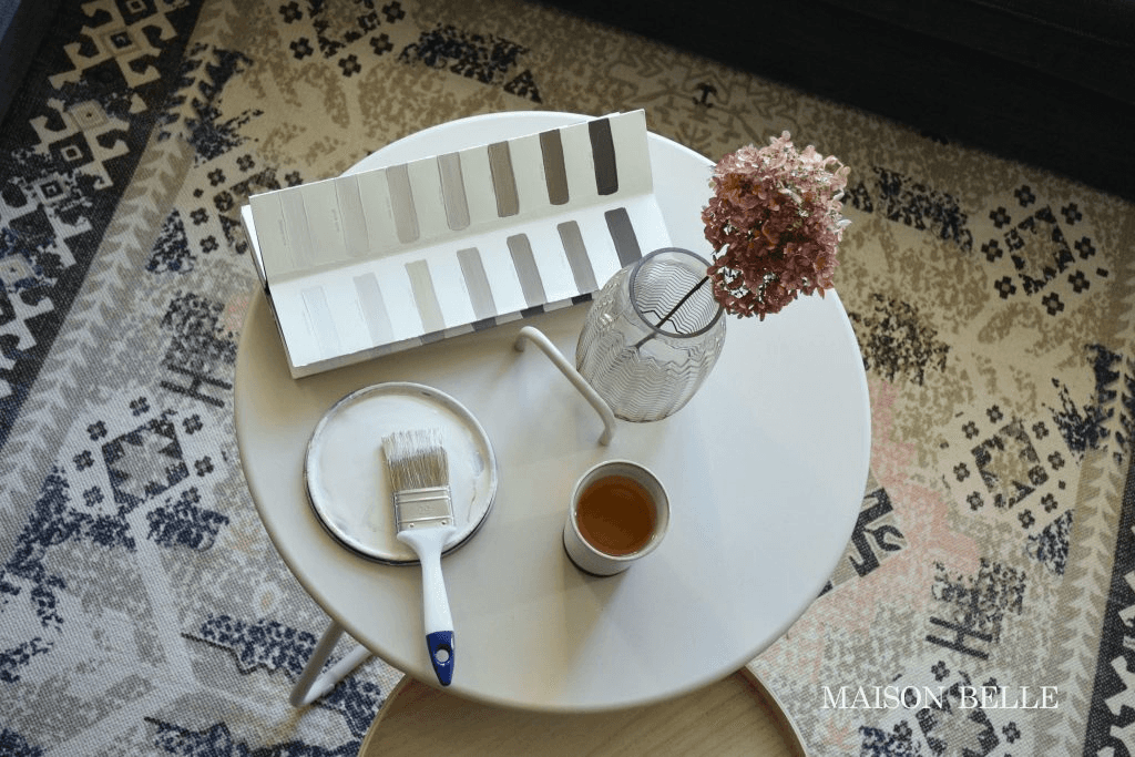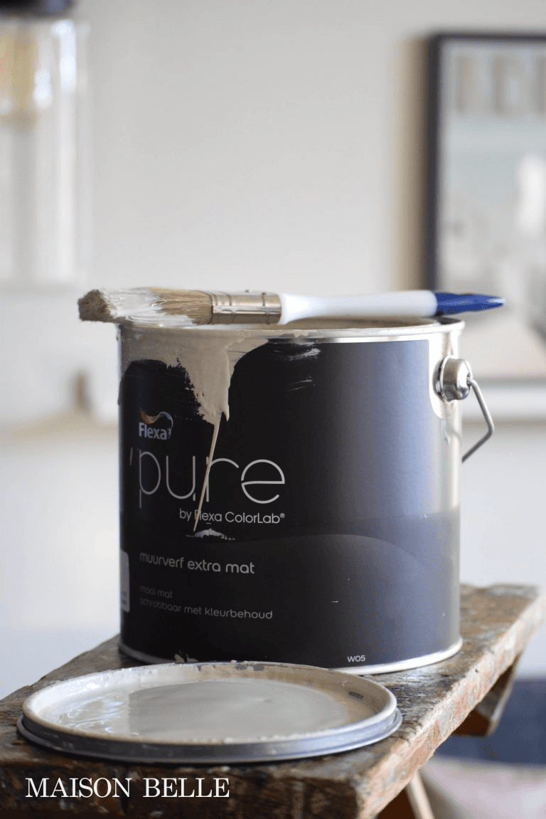 Op de planning stond het schilderen van de wanden. Ze waren al een lange tijd dezelfde kleur en hadden wat beschadigingen. Dagelijks geef ik interieuradvies en kleuradvies bij mensen thuis dus nu bij ons zelf. Een tint die ik met veel regelmaat toepas op wanden is: Taupe of Greige. Taupe zit tussen grijs en bruin in, de lichte variant wordt wel Greige genoemd: het is een combinatie van grijs en beige. Waarom ben ik zo enthousiast over deze kleurfamilie? Omdat deze kleuren warm en heel natuurlijk zijn. De warmte omarmt een interieur met gezelligheid en het zorgt voor een perfecte, rustige basis. Bovendien passen ze elke woonstijl. Dus wordt onze eigen zithoek nu ook: Greige van kleur.