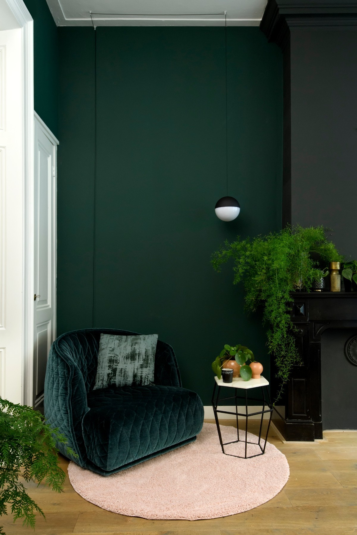 Vind je de kleur Quit Clearing ook zo mooi maar wil je niet alle muren schilderen? Ga dan aan de slag met kleurvlakken. Een vlak op de muur plak je af met tape en je schildert de groene muurverf eenvoudig met een verfroller binnen het vlak. Waarschijnlijk heb je wel twee lagen verf nodig om de donkere kleur goed te laten dekken. Hier is een vlak geschilderd om de deur heen maar je kunt er ook voor kiezen om een lambrisering af te plakken en de onderkant van de wand groen te schilderen en boven wit te laten. Zo ontstaat er een speels effect en wordt het niet té donker.