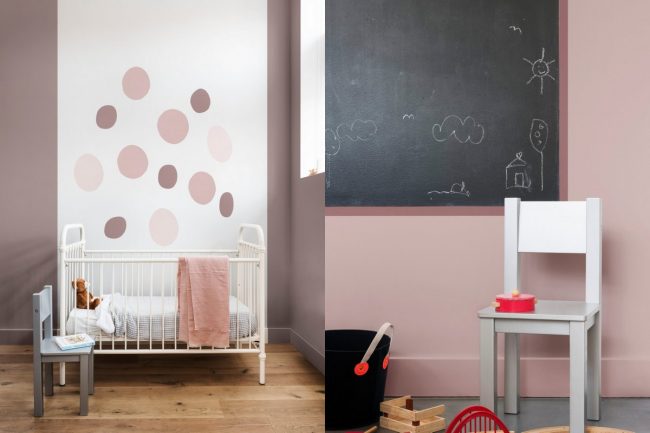 De kamer van je kleintje wordt prachtig in de kleur Heart Wood. Combineer je het met wit dan oogt het fris, blauw of grijs erbij geeft een stoerder effect en kan ook mooi in een jongenskamer of stoere babykamer. Met de cirkels op de wand en het geschilderde schoolbord ontstaat er een speels kamertje, zonder dat het te druk wordt. De schoolbord-wand geeft plek aan een mooi gedichtje of een lieve tekening. Je kleintje kan hier zelf straks heerlijk tekenen en spelen.