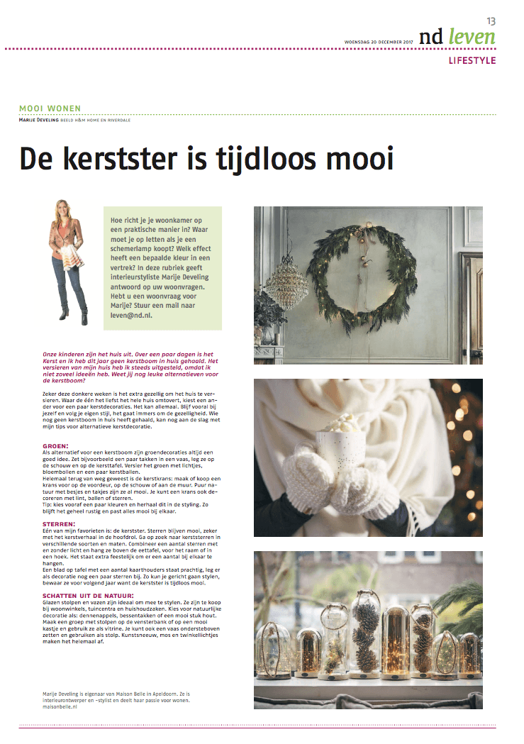 Eén van mijn favorieten is: de kerstster. Sterren blijven mooi, zeker met het kerstverhaal in de hoofdrol. Ga op zoek naar kerststerren in verschillende soorten en maten. Combineer een aantal sterren met en zonder licht en hang ze boven de eettafel, voor het raam of in een hoek. Het staat extra feestelijk om er een aantal bij elkaar te hangen.