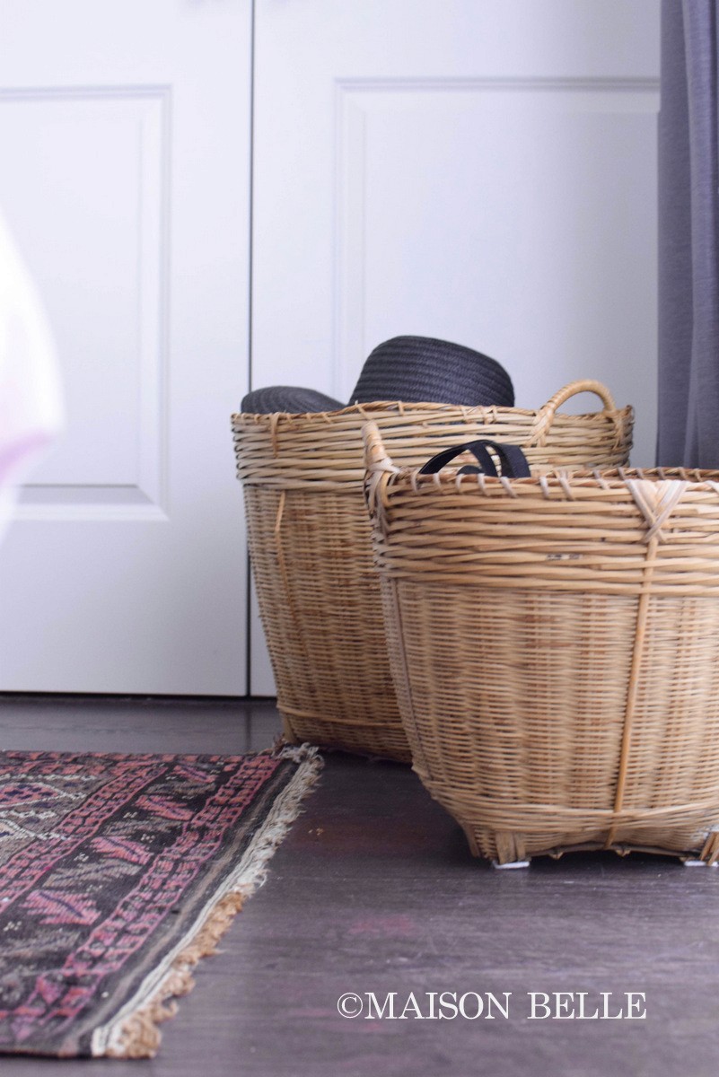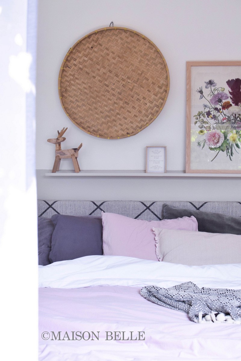 De boho interieur stijl is door styling heel goed aan te brengen aan een wit interieur. Natuurlijke materialen, oude manden, vintage meubels en oosterse kleden en patronen zorgen voor deze bohemien sfeer. Over het hoofdbord van de boxspring hing ik een vloerkleed zodat het bed wat minder strak oogt. Een leuke manier om je bed eens een nieuwe look te geven. (Deze dunne kleden gooi ik trouwens op een koud wasprogramma in de wasmachine zodat we met ons hoofd tegen schone stof liggen.)