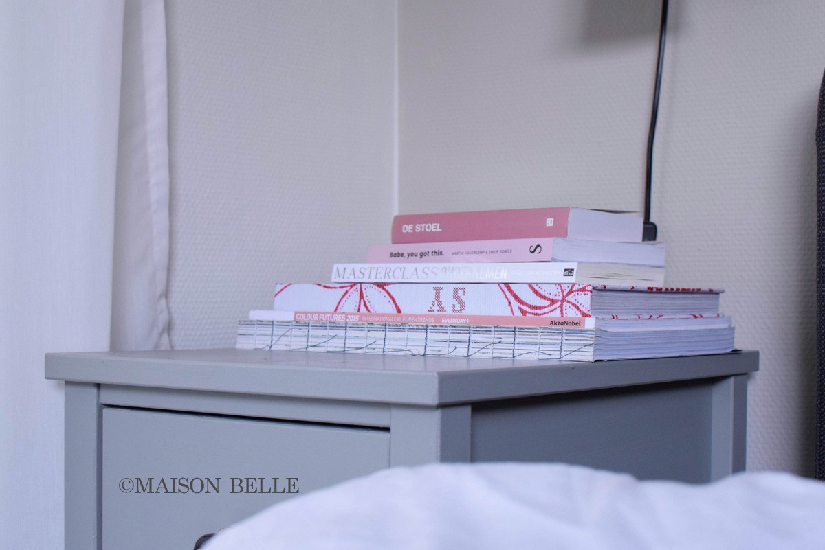In het beddengoed, de wandaankleding en de grote hanglamp voeg ik kleur en sfeer toe. Het oud roze dekbedovertrek maakt het geheel wat zachter en zorgt voor de nude uitstraling. Het enige wat ik nieuw kocht is de poster met oude bloemenprint. Zelfs de verf had ik nog staan. Ik gebruikte deze kleuren ook in de woonkamer, je ziet het in deze blog. Stiekem komen ze hier nog mooier uit omdat deze kamer veel lichter is.