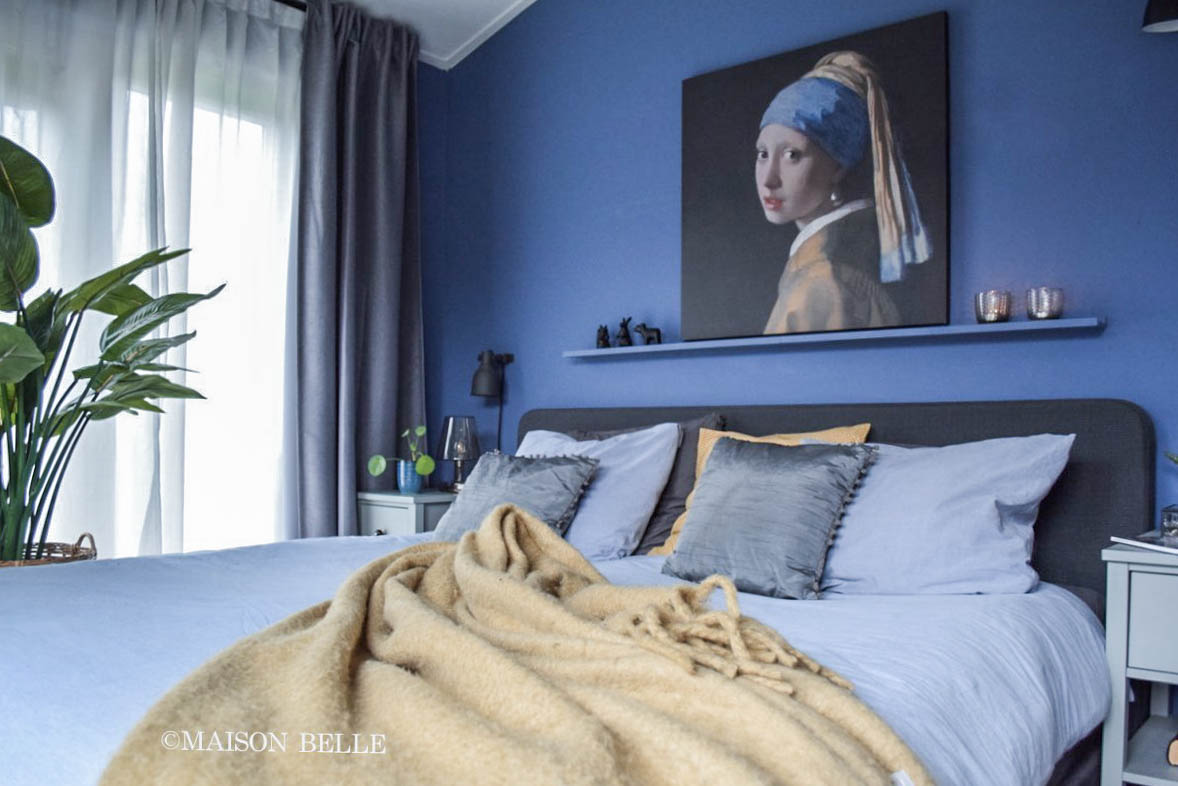 Het "meisje met de parel" kwam op de wand boven het bed, ik verving de dekbedhoes en haalde de oker-gele kussens en het kleed van de bank. Een paar accessoires heb ik aangepast zodat het een mooi geheel werd. Als bonus vond ik in de sale een geweldige hanglamp van HK Living. Precies in de kleur oker-geel die de slaapkamer kon gebruiken. Eigenlijk is alleen de lamp nieuw gekocht en de rest verplaatst van de ene naar de andere ruimte.