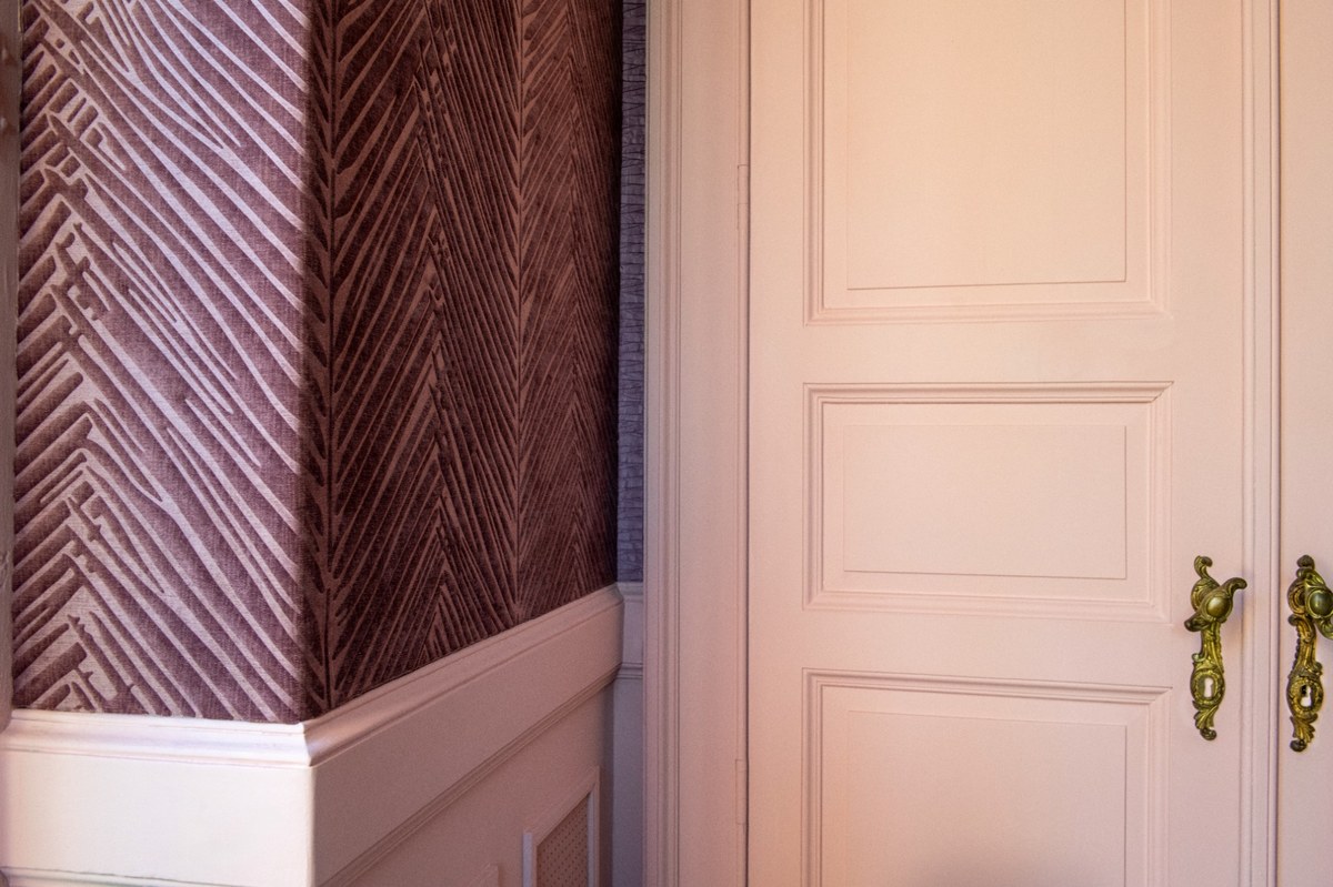 Behang: Arte – Palma Plum 43030 gecombineerd met zacht roze op het houtwerk