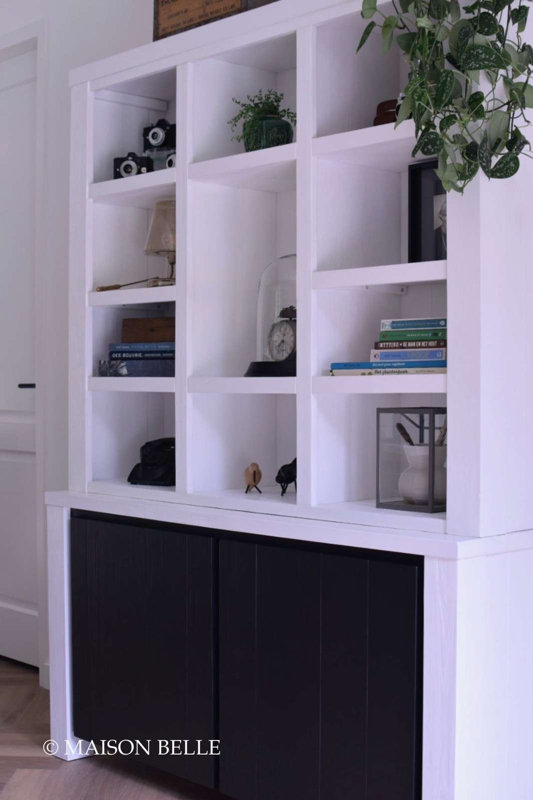 Een vakkenkast is altijd een goed idee! Ideaal voor opbergruimte en de open vakken geven de mogelijkheid om heerlijk mee te stylen. Op deze manier kan je persoonlijke items een prominente plek geven zonder dat het te druk en onrustig wordt. Een zwarte vakkenkast stond dan ook al jaren op mijn eigen wensenlijstje.